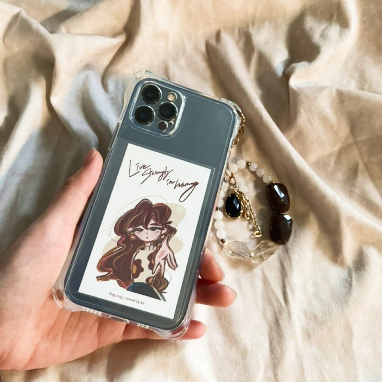 A smartphone strap made with natural stones, paired with an illustration card inspired by them.