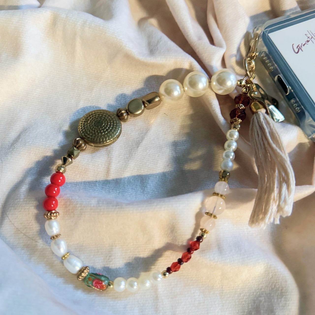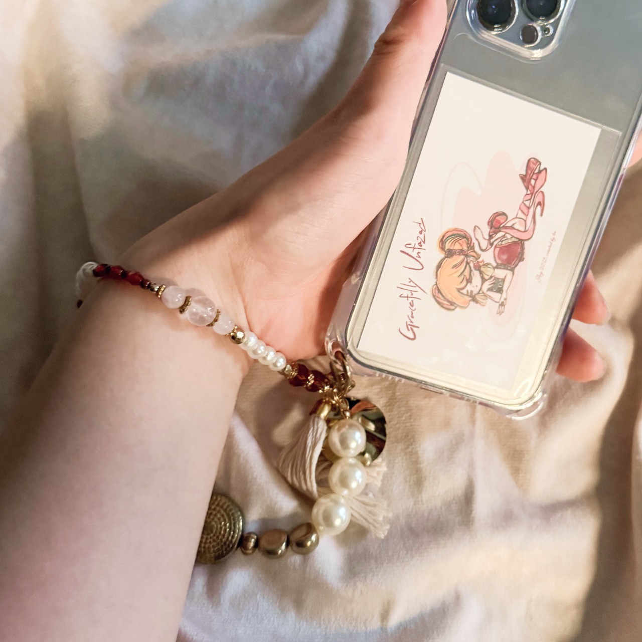 A smartphone strap crafted with natural stones, paired with an illustration card inspired by them.