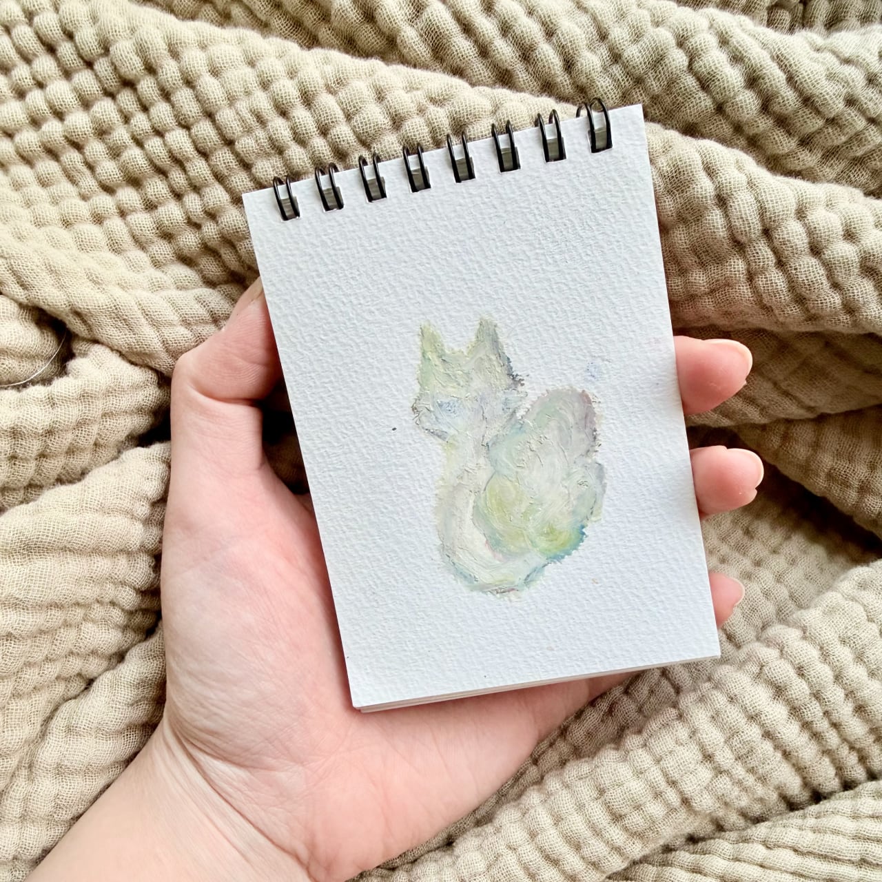 小さなスケッチブックに描いた、手のひらサイズの一点物のねこ。